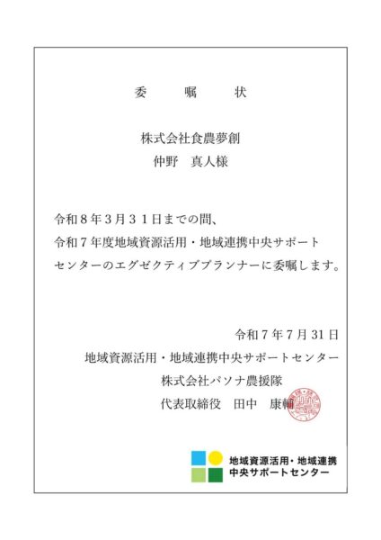今年度、地域資源活用・地域連携エグゼクティブプランナーに弊社代表の仲野が任命いただきました!